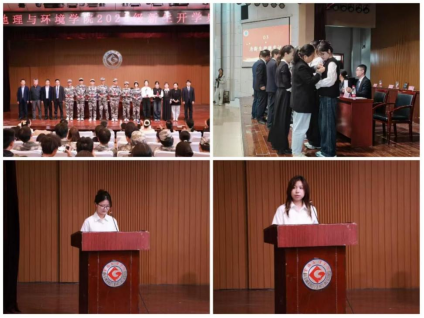 副院长、系(中心)主任为新生代表们颁发学生证并佩戴校徽。在校生代表2022级地理科学专业林铭心,为2025级新生送上祝福和希冀;2025级地理科学专业马小靖代表全体新生作了发言,祝愿每位新同学都收获知识与友谊。